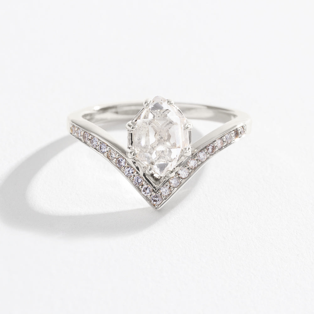 A solid Sterling Silver band measuring 2mm by 2mm, showcasing one 6x8mm raw Herkimer Diamonds accompanied with twenty-one 1.2mm faceted round Diamonds that rest 6mm above the finger.